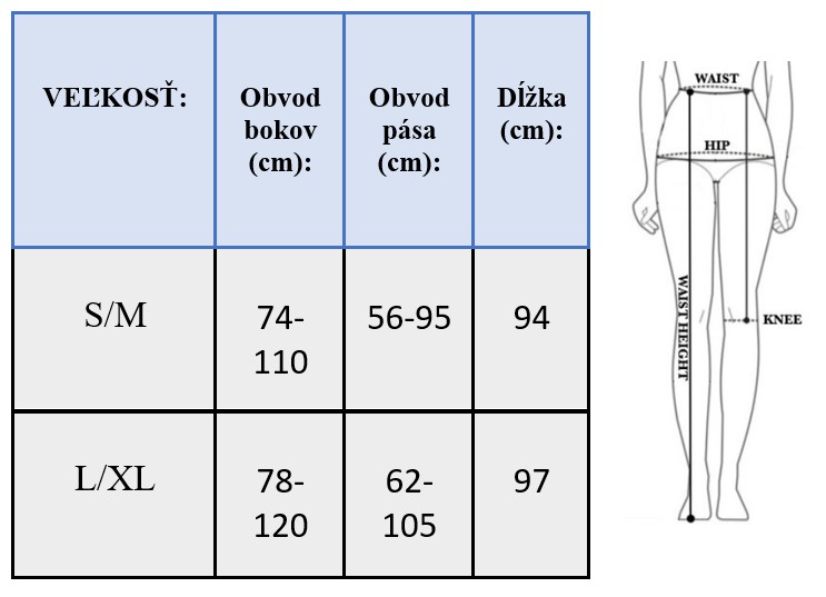 S/M pás: 56-95 cm dĺžka: 94 cm boky: 74-110 cm